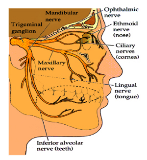 Trigeminal neuralgia is characterized by sudden bursts (paroxysms) of face pain. These bursts are often triggered by a light touch around the mouth or face or by talking, eating, or brushing one's teeth. The pain sometimes gets worse or better for periods of weeks or months. The pain is in the areas supplied by the trigeminal nerve: the cheeks, jaw, teeth, gums, lips and less often around the eye or forehead. Usually pain occurs on just one side of the face, but in five to 10 percent of patients, pain occurs on both sides of the face, although not at the same time. The pain responds to Tegretol (Carbamazepine is the generic name), but sometimes the dose has to be increased and unpleasant side effects can occur.